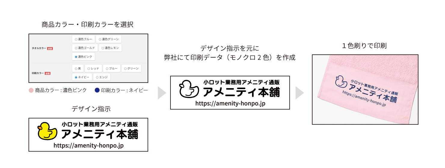 商品カラー・印刷カラーをお選びいただき、デザイン指示(ロゴデータや印刷したい文字)をアップロードいただくことで、タオルに名入れ印刷ができる商品となります。