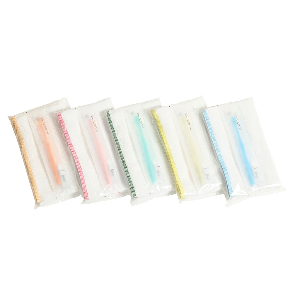 160匁 耳カラータオル・ハブラシセット(5色アソート)濃色巾着袋入り 200セット