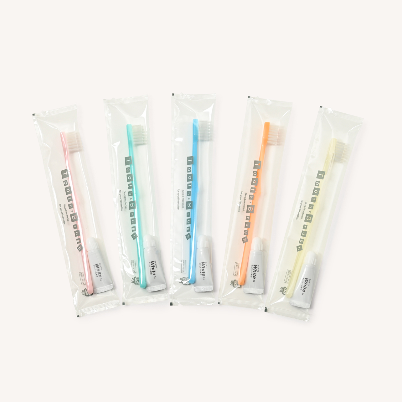 ハブラシ | 国産24穴(カラー) 3gハミガキ粉付 透明袋入り 5色(ブルー、イエロー、ピンク、グリーン、オレンジ) |